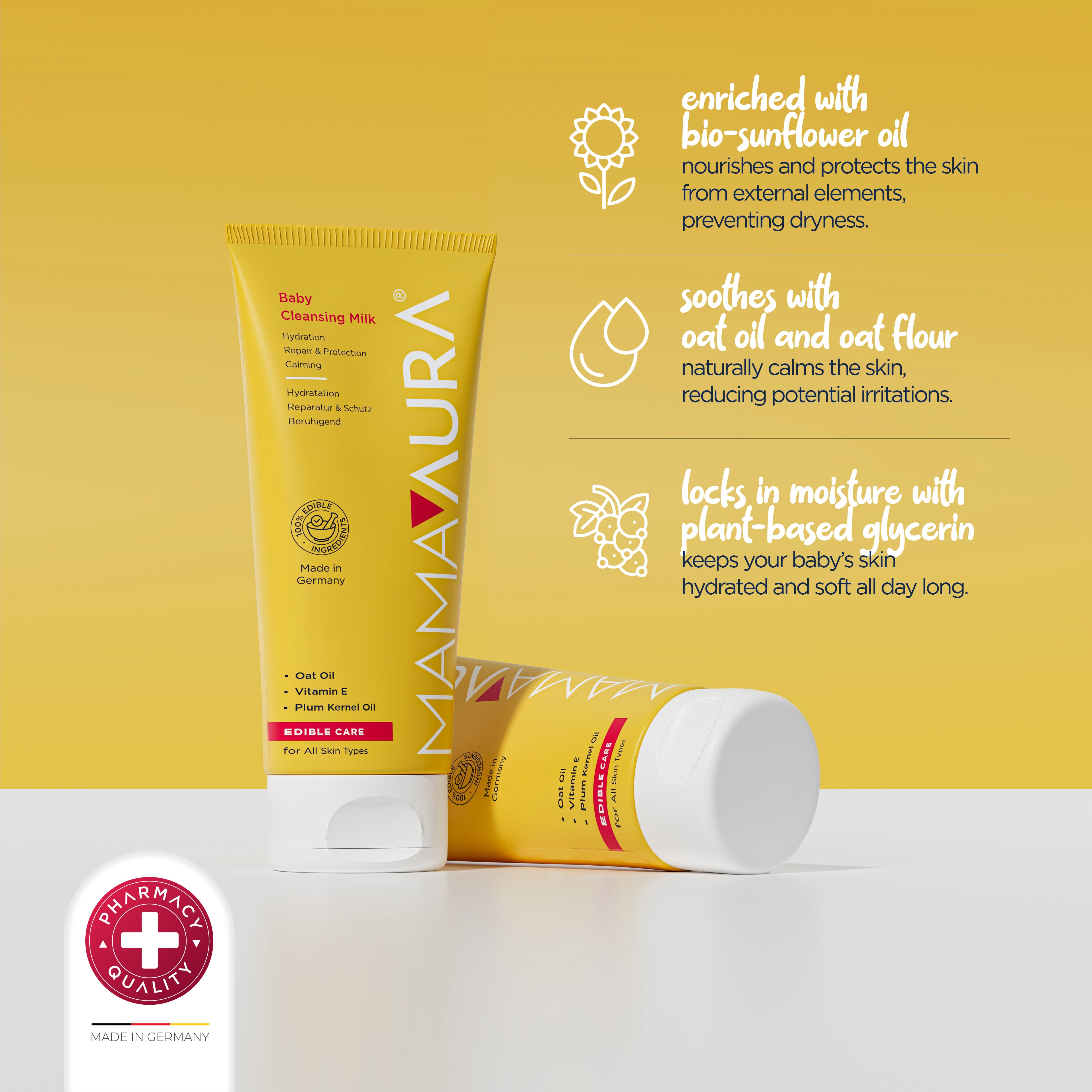 Mamaaura Baby Cleansing Milk is formulated with a blend of high-quality, food-grade ingredients designed to provide gentle and effective care for your baby’s delicate skin. Here’s a detailed explanation of the ingredients and their benefits: