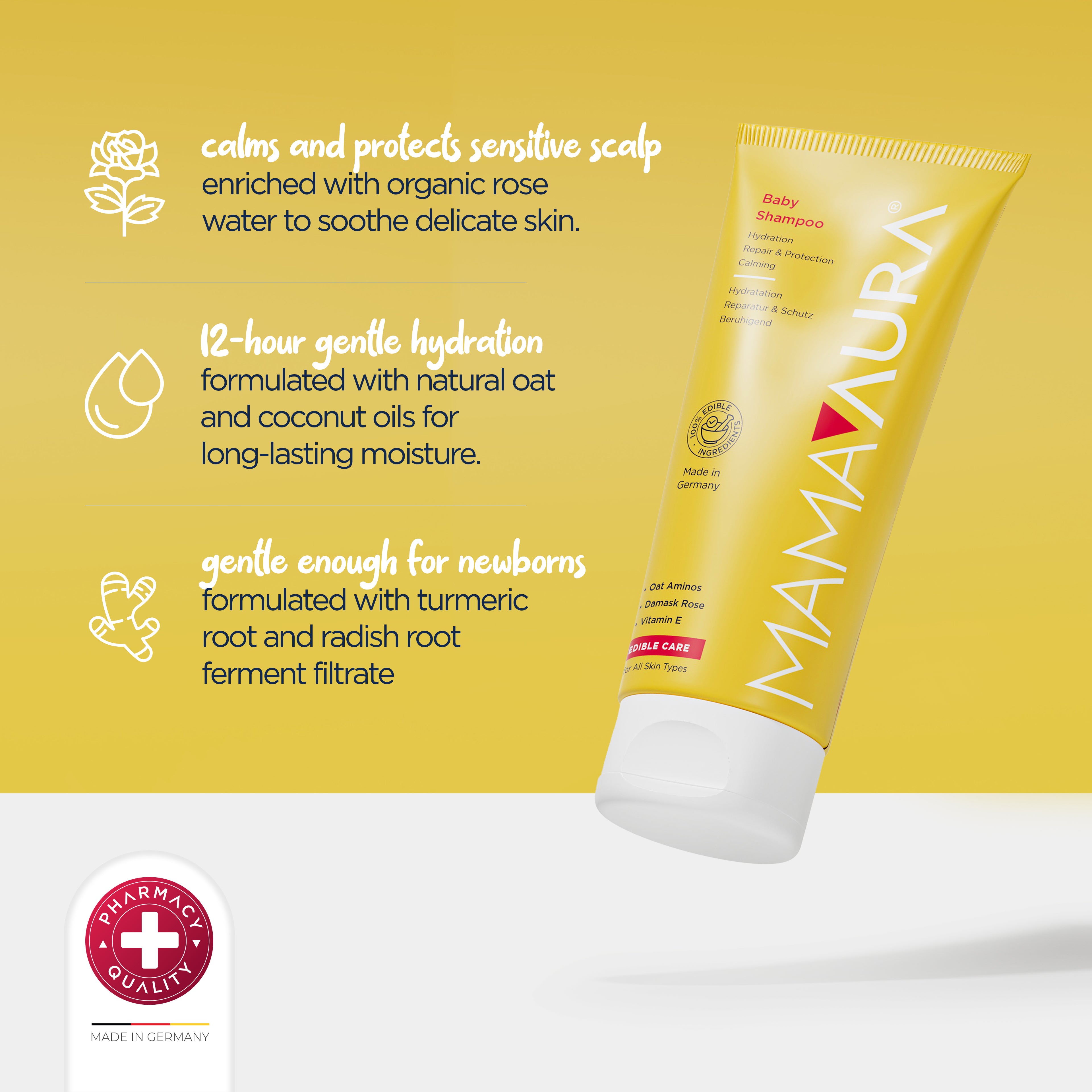 Mamaaura Baby Shampoo gently cleanses and hydrates your baby’s delicate scalp and hair with 100% edible ingredients. Enriched with oat amino acids, plant-based glycerin, and organic coconut oil, it preserves natural oils and provides deep moisture. The soothing formula, featuring organic rose water and Lactobacillus ferment, helps create a healthy scalp environment and reduces the risk of cradle cap. Safe for newborns and sensitive skin, this shampoo ensures a gentle, tear-free bathing experience.