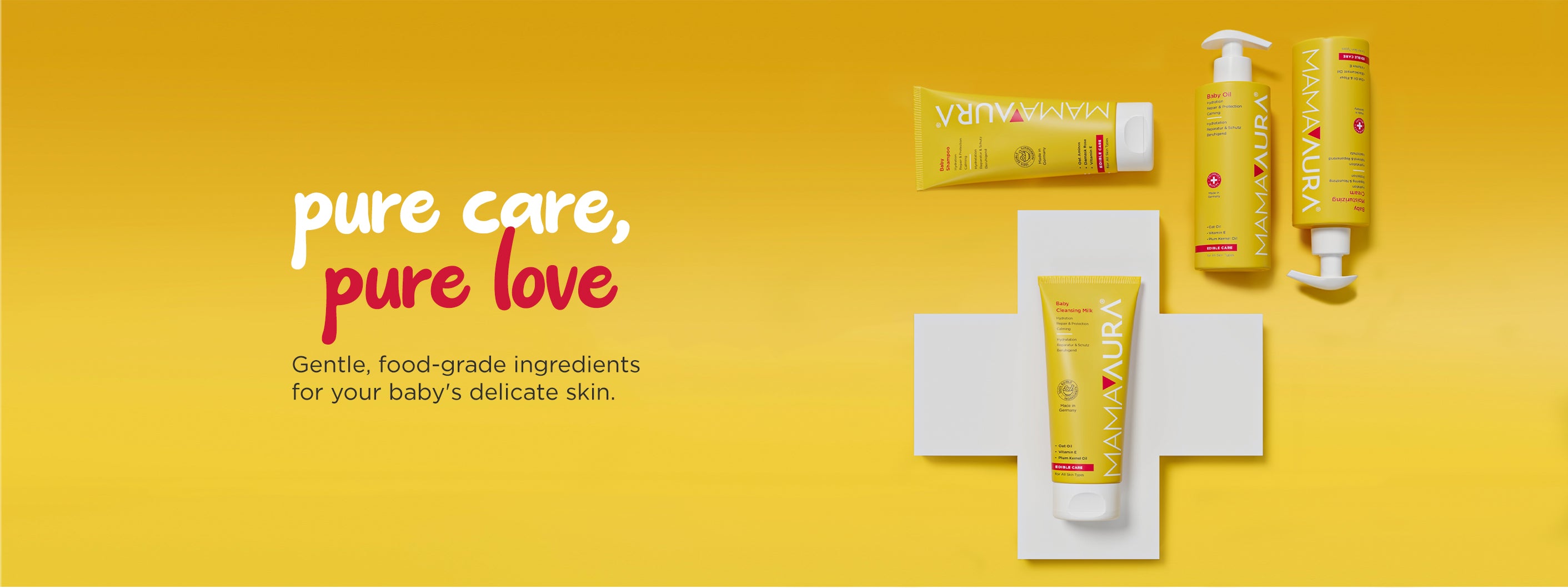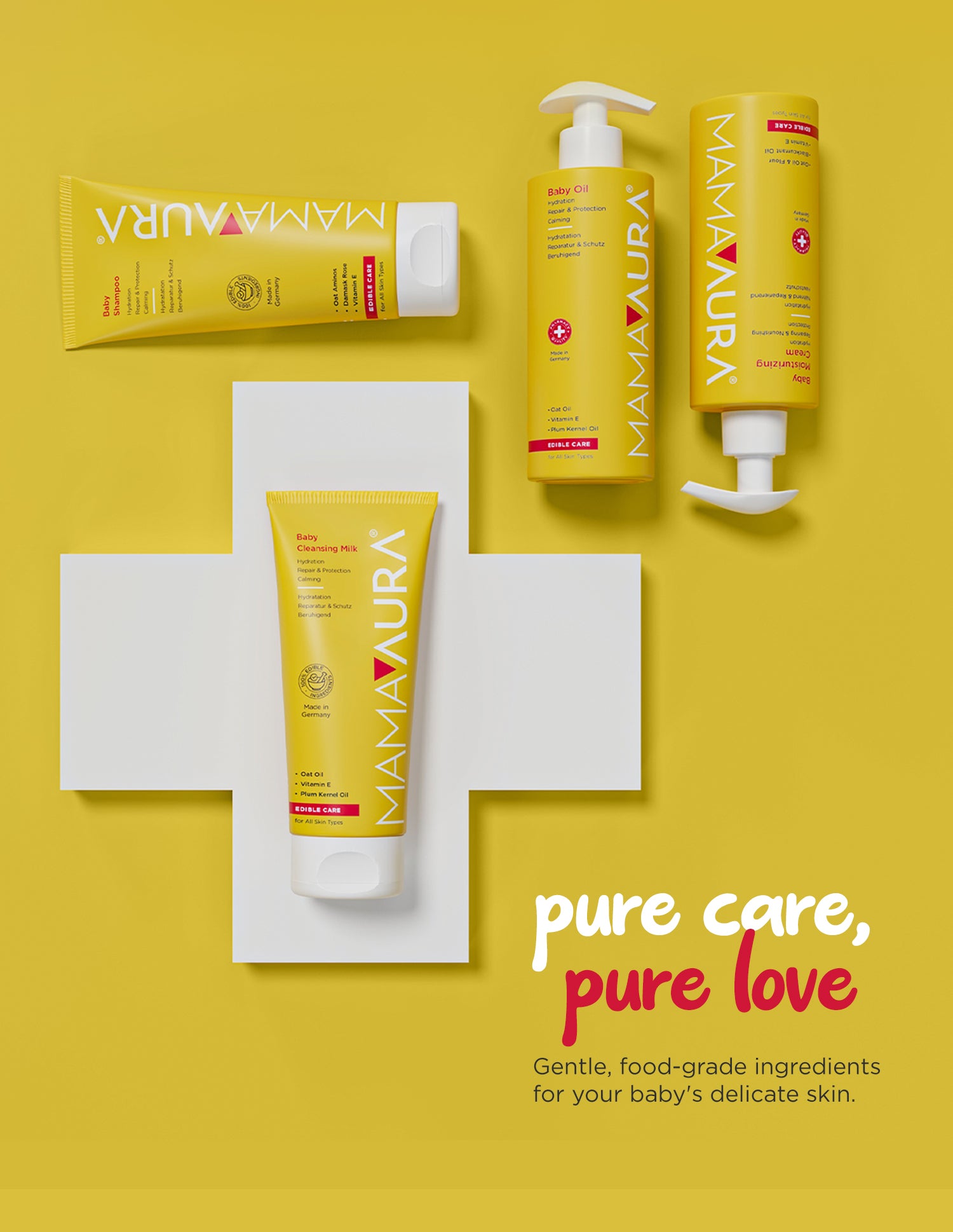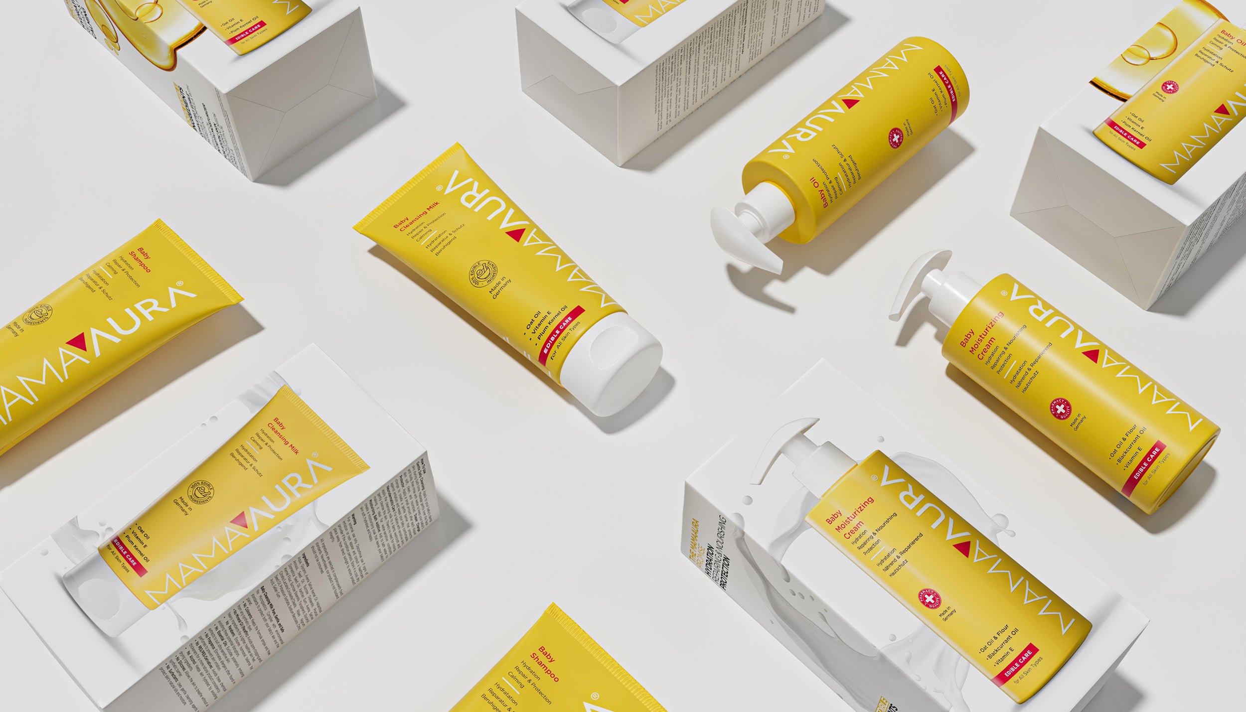 Mamaaura Baby Series is a masterpiece formulated with edible* food ingredients. We have combined the best of what nature offers and the precision of science to protect and care for your baby's delicate skin. With our safe, effective, and gentle formulas, we support your baby in safely exploring the world with every touch. We are not only protecting the skin but also promoting the healthy development of your baby's skin.